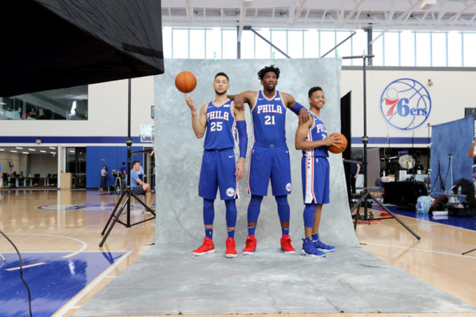 Ben Simmons, Joel Embiid e Markelle Fultz durante una sessione fotografica prima dell’inizio della stagione 2017/2018. (Abbie Parr/Getty Images)