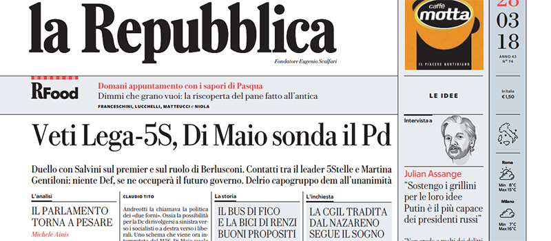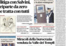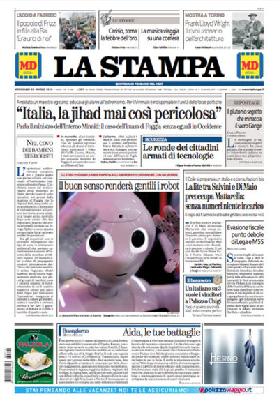 Quasi tutti i giornali di oggi aprono sulle trattative fra Movimento 5 Stelle e Lega per la formazione del nuovo governo, e i titoli di oggi sono più orientati al pessimismo dopo la richiesta di Di Maio di essere lui a guidare il governo e quella di Salvini di includere nella maggioranza anche Forza Italia. La Stampa invece intervista il ministro dell’Interno Minniti sulle minacce del terrorismo islamista in Italia, dopo l’arresto di un maestro a Foggia con l’accusa di educare gli alunni all’estremismo, l’Osservatore Romano apre con il viaggio in Cina del leader della Corea del Nord Kim Jong-un, mentre i giornali sportivi commentano il pareggio dell’Italia con l’Inghilterra in amichevole.