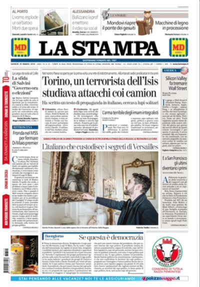 Ci sono notizie diverse in apertura sui giornali di oggi: alcuni seguono la cronaca politica, con le trattative fra i partiti per la formazione del nuovo governo che non sembrano fare passi avanti e le elezioni dei vicepresidenti del Senato, altri titolano sull’arresto a Torino di un italo-marocchino con l’accusa di far parte dell’ISIS e di voler progettare attentati in Italia. Avvenire e il Manifesto si occupano dei dati presentati ieri da INPS e governo sul reddito di inclusione, il Sole 24 Ore espone i dati sulle dichiarazioni dei redditi del 2017 degli italiani, e il Dubbio apre sull’inchiesta CONSIP.