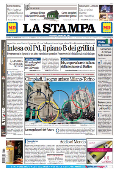 La maggior parte dei giornali di oggi segue in apertura la cronaca politica con le trattative fra i partiti per la formazione del nuovo governo: oggi la prospettiva cambia, e si parla della possibilità di un accordo fra Movimento 5 Stelle e Partito Democratico, nel quale si alzano voci contrarie alla linea dell’ex segretario Renzi di stare comunque all’opposizione. Altri giornali titolano sugli arresti di cinque persone con l’accusa di aver aiutato l’uomo che nel dicembre 2016 uccise 12 persone investendole con un camion a Berlino, mentre il Dubbio apre sul proscioglimento del sindaco di Milano Sala per la vicenda degli alberi piantati per l’Expo.