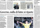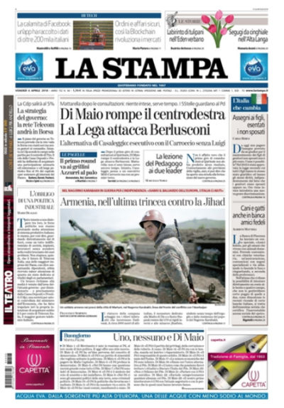 La chiusura del primo giro di consultazioni per la formazione di un nuovo governo è in apertura su tutti i giornali, che sottolineano le parole del presidente della Repubblica Mattarella che chiede tempo per consentire alle delegazioni dei partiti di trovare un accordo su un programma comune, e vedono più vicina l’ipotesi di un’intesa fra Movimento 5 Stelle e Lega, dopo la conferma del veto di Di Maio su Forza Italia e della volontà del Partito Democratico di non far parte della maggioranza.