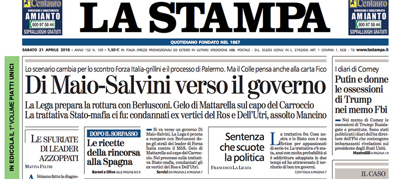 Le due notizie principali in apertura sui giornali di oggi sono due trattative: la prima è quella fra i partiti per la formazione del nuovo governo, con la conclusione dell’incarico del presidente del Senato Casellati che ha riferito dei suoi incontri al presidente della Repubblica Mattarella e le parole di Silvio Berlusconi sul Movimento 5 Stelle che sembrano provocare una rottura fra Forza Italia e Lega; la seconda è quella presunta fra stato e mafia, per la quale a Palermo sono stati condannati politici e alti funzionari dello stato nel processo di primo grado, e sulla quale i giornali hanno posizioni molto diverse.