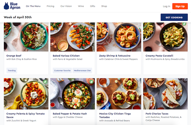 Chi si iscrive a servizi di meal-kit come quello di Blue Apron – il più grande e famoso, soprattutto negli Stati Uniti – può scegliere quelle che preferisce da un menù di ricette molto diverse tra loro e indicare in quali giorni vuole ricevere le scatole con tutti gli ingredienti. Gli abbonati – che di solito devono impegnarsi ad acquistare almeno un tot di pasti a settimana – ricevono così cibo fresco, nella quantità giusta per una cena, senza dover andare a comprarlo, e senza correre il rischio di non sapere come cucinarlo o di dimenticarsi un ingrediente fondamentale per la ricetta.