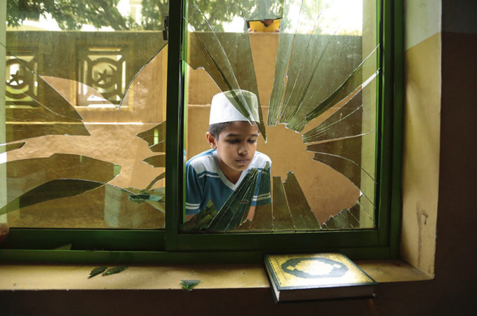 Un ragazzo musulmano dello Sri Lanka guarda attraverso una finestra rotta di una moschea, Kandy, 9 marzo 2018 (AP Photo / Tharaka Basnayaka)