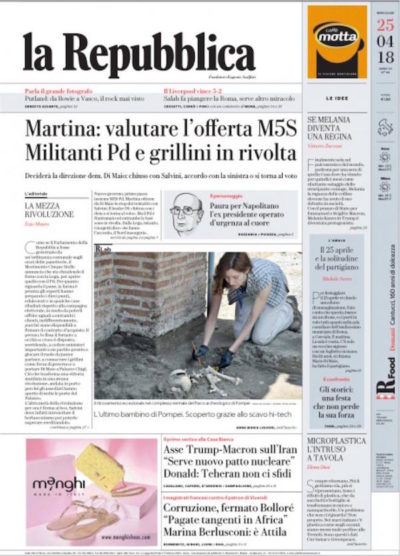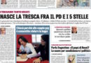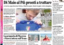 Le due grandi notizie sulle prime pagine di oggi sono le aperture del Movimento 5 Stelle a un governo con il Partito Democratico – i titoli dei diversi giornali, a scorrerli in fila, sono quasi ipnotici nella loro uniformità – e la sconfitta della Roma nella semifinale di andata di Champions League contro il Liverpool. Tra le altre notizie, ricorrono più spesso di altre quelle sull’arresto di Vincent Bollorè e quelle sul viaggio di Emmanuel Macron negli Stati Uniti.