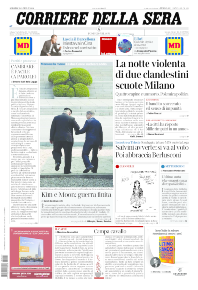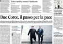 Oggi è una di quelle volte in cui la principale notizia dei quotidiani italiani ha a che fare con gli esteri. In questo caso si tratta dell’incontro di ieri tra il dittatore della Corea del Nord, Kim Jong-un, e il presidente sudcoreano Moon Jae-in, che hanno firmato una dichiarazione di intenti comune, che prevede di formalizzare la fine della guerra tra le due Coree e un programma di denuclearizzazione. Per quanto riguarda l’Italia, si legge su diverse prime pagine il nome di Matteo Renzi: perché, ora che Movimento 5 Stelle e Partito Democratico stanno vedendo se ci sono le premesse per governare insieme, lui andrà ospite a Che tempo che fa (il 29 aprile, dopo le elezioni in Friuli Venezia Giulia). Per il calcio, è il giorno di Inter-Juventus.
