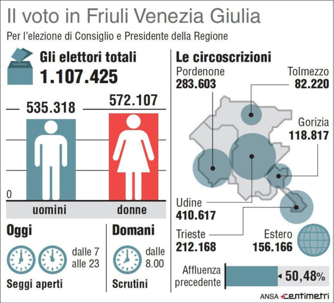 Si sono aperti alle 7 i seggi delle elezioni regionali in Friuli Venezia Giulia, che come quelle in Molise di domenica scorsa – vinte dal centrodestra – avranno una rilevanza nazionale, vista la complicata fase di formazione del governo. Il favorito alla vittoria è Massimiliano Fedriga, candidato della Lega Nord appoggiato da tutto il centrodestra. Sergio Bolzonello, vicepresidente uscente del Partito Democratico, è dato a grande distanza, così come Alessandro Fraleoni Morgera, il candidato del Movimento 5 Stelle, partito che non è mai andato particolarmente bene nella regione e che, alle elezioni locali, solitamente perde molti consensi. C’è un quarto candidato, Sergio Cecotti del Patto per l’autonomia, dato a pochi punti percentuali nei sondaggi. I seggi chiuderanno alle 23, ma lo scrutinio inizierà alle 8 di domani.