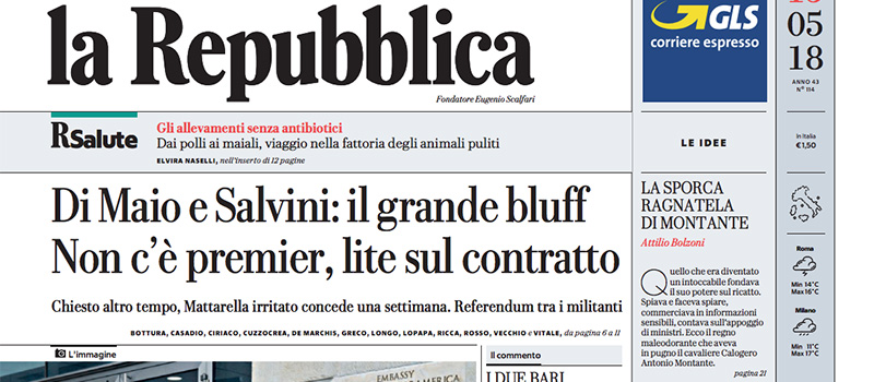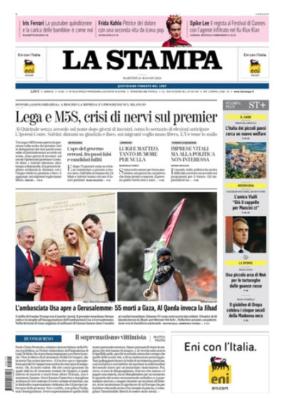 La maggior parte dei giornali di oggi titola sugli incontri di ieri fra il presidente della Repubblica Mattarella e i leader di Lega e Movimento 5 Stelle Salvini e Di Maio, che sembravano aver raggiunto un accordo per la formazione del nuovo governo ma che invece hanno chiesto a Mattarella altro tempo per proseguire le trattative. L’altra notizia di ieri, sulla quale aprono alcuni giornali, è l’inaugurazione dell’ambasciata degli Stati Uniti in Israele a Gerusalemme, e le proteste contro questa scelta a Gaza, dove i soldati israeliani hanno sparato uccidendo più di cinquanta persone.