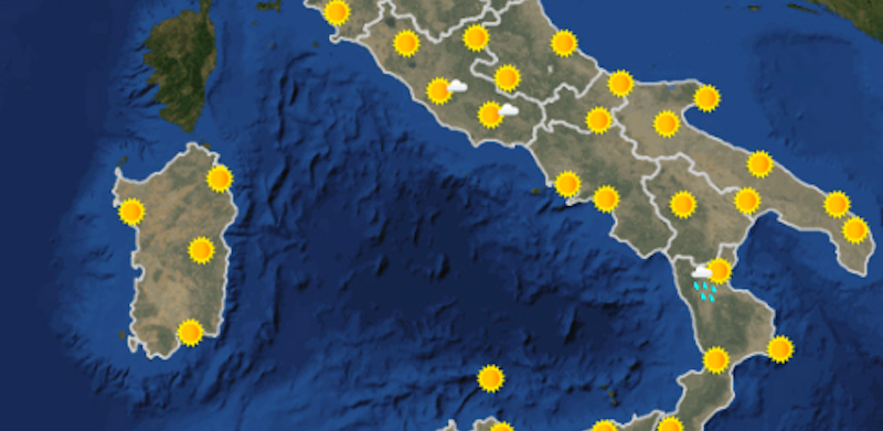 Sulle zone alpine sarà bello soprattutto la mattina, l’ideale per progettare gite brevi; nel caso, speriamo vi siate già procurati una di queste. Nel pomeriggio il tempo peggiorerà, con nubi e piogge sparse, che però si attenueranno verso la fine della giornata. Ci saranno “velature” – nuvole poco compatte – anche in alcune zona della Sardegna, nel pomeriggio, mentre per la serata sono attese fra Sicilia, Campania e Calabria meridionale. Le temperature minime saranno in rialzo un po’ ovunque. Tutti i mari saranno calmi o poco mossi ad eccezione del Mar di Sardegna.