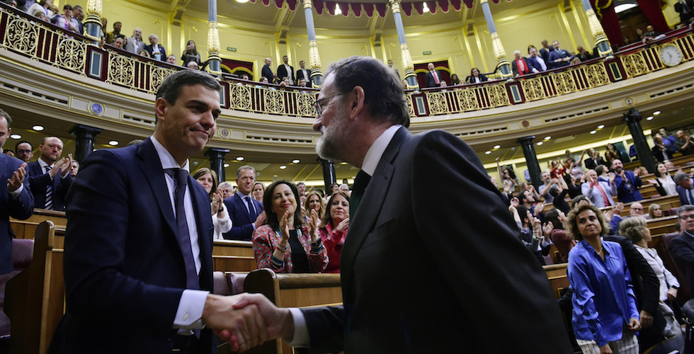 Mariano Rajoy stringe la mano a Pedro Sánchez dopo l’approvazione della mozione di sfiducia contro il suo governo (Pierre-Philippe Marcou – Pool/Getty Images)