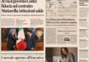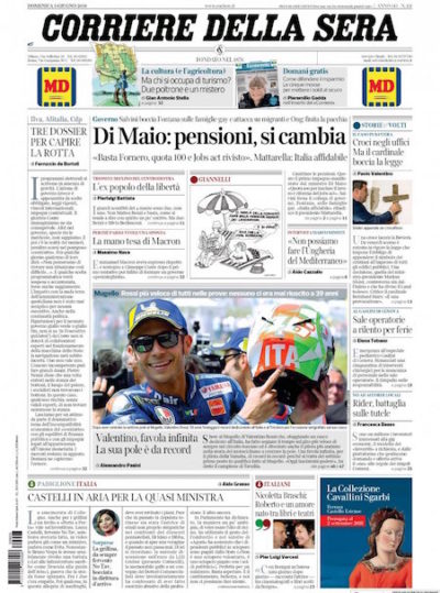 Buona parte delle prime pagine di oggi è occupata dalle prime dichiarazioni di Luigi Di Maio e Matteo Salvini da ministri, rispettivamente del Lavoro e degli Interni. Proseguono, intanto, le polemiche su Lorenzo Fontana, il ministro più di destra del nuovo governo. Sui giornali sportivi trova spazio soprattutto il calciomercato, che quest’anno chiuderà molto prima del solito – a metà agosto – e quindi è già entrato nel vivo.