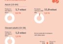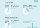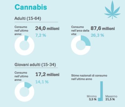Se si considera la sola fascia d’età dai 15 ai 34 anni, l’Italia è il secondo paese per uso di cannabis: si stima che il 20,7 per cento degli adulti più giovani ne abbia fatto uso nei 12 mesi precedenti all’ultima indagine condotta in merito, nel 2017, contro il 21,5 della Francia. Dal 2011 a oggi il consumo di cannabis tra i giovani è aumentato: allora si stimava che il 15,4 per cento ne facesse uso. Parlando di cannabis è comunque particolarmente importante distinguere i consumatori quotidiani o quasi quotidiani da quelli occasionali: si stima che solo l’1 per cento degli adulti europei appartenga alla prima categoria e che il 37 per cento di loro abbia un’età compresa tra i 35 e i 64 anni; tre quarti sono di genere maschile.