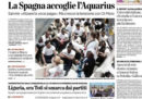 La vicenda della nave Aquarius della ong SOS Mediterranée con a bordo oltre 600 migranti è in apertura sulla maggior parte dei giornali di oggi, che titolano sull’offerta del governo spagnolo di farla approdare nel porto di Valencia dopo che il ministro dell’Interno Salvini aveva annunciato di voler bloccare i porti italiani per non accoglierla. L’altra notizia presente su tutte le prime pagine, e in apertura su qualche giornale, sono i risultati delle elezioni amministrative di domenica, con l’affermazione del centrodestra e le difficoltà del Movimento 5 Stelle.