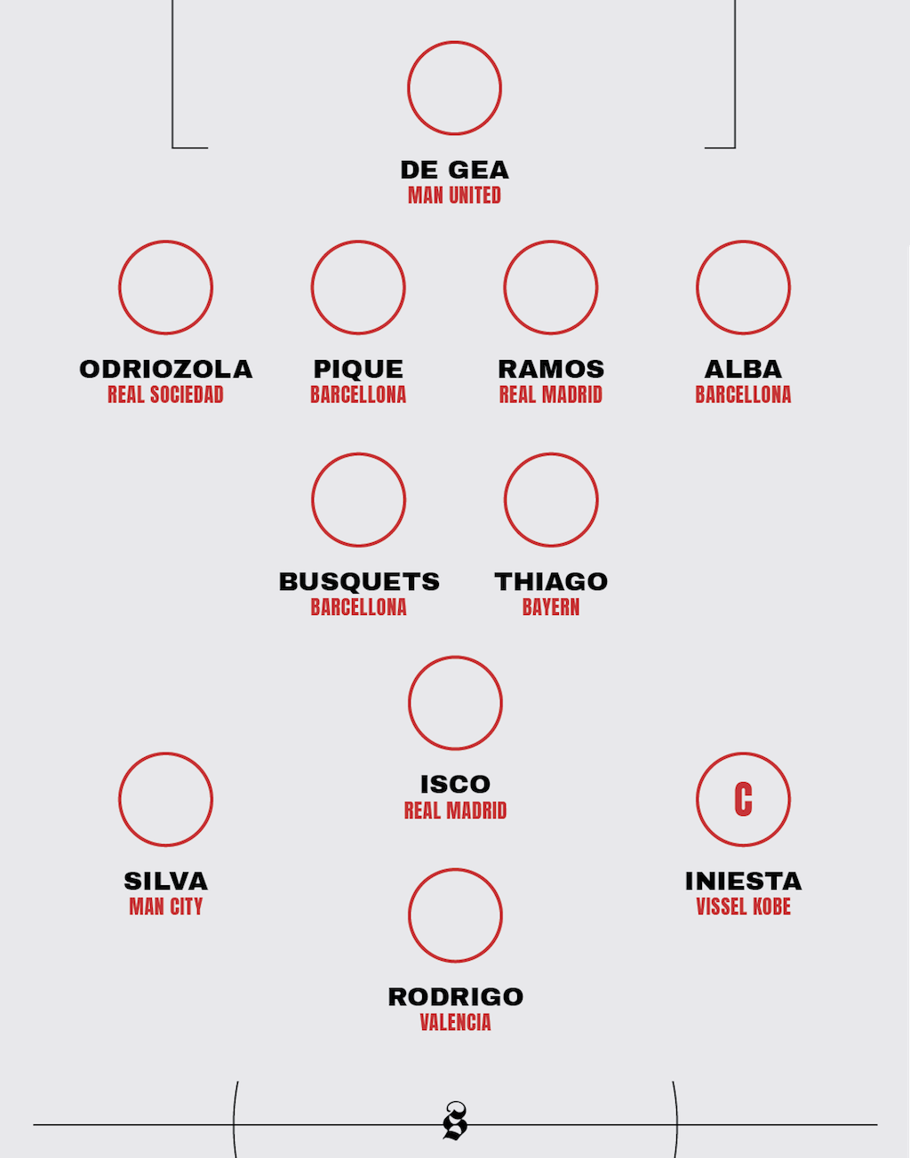 Da quando Villa e Torres hanno lasciato la nazionale, la Spagna ha faticato a trovare dei sostituti adeguati. Negli Europei vinti nel 2012 giocò addirittura senza un vero e proprio centravanti. Questo fu possibile per via della quantità di registi e centrocampisti con spiccate doti offensive a disposizione della squadra: nella finale vinta contro l’Italia, per esempio, giocarono insieme Xabi Alonso, Busquets, Xavi, Fabregas, Iniesta e Silva. Finì 4-0 e la Spagna ebbe il controllo del campo e del possesso palla dal primo all’ultimo minuto, dando sempre l’idea di eseguire tutto con estrema facilità.