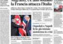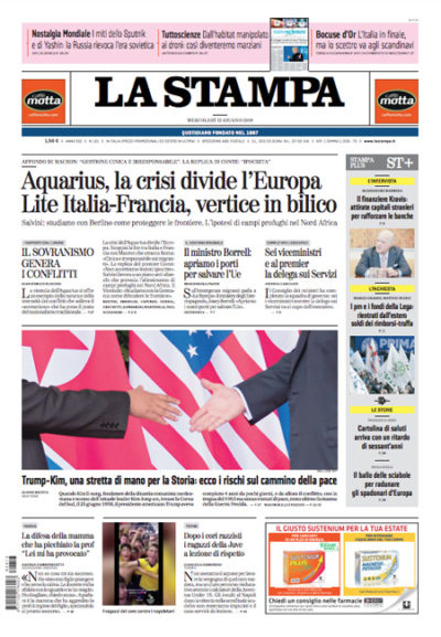 Sono due le notizie principali in apertura sui quotidiani di oggi: lo scambio di accuse fra Italia e Francia sulla gestione dei migranti, dopo la vicenda della nave Aquarius alla quale non è stato permesso di sbarcare in Italia le oltre 600 persone raccolte nel Mediterraneo, e l’incontro a Singapore fra il presidente degli Stati Uniti Trump e il leader della Corea del Nord Kim Jong-un, con molti giornali che pubblicano le foto della stretta di mano fra i due. Solo il Fatto fa una scelta diversa, aprendo su un’indagine della procura di Genova sui fondi della Lega.