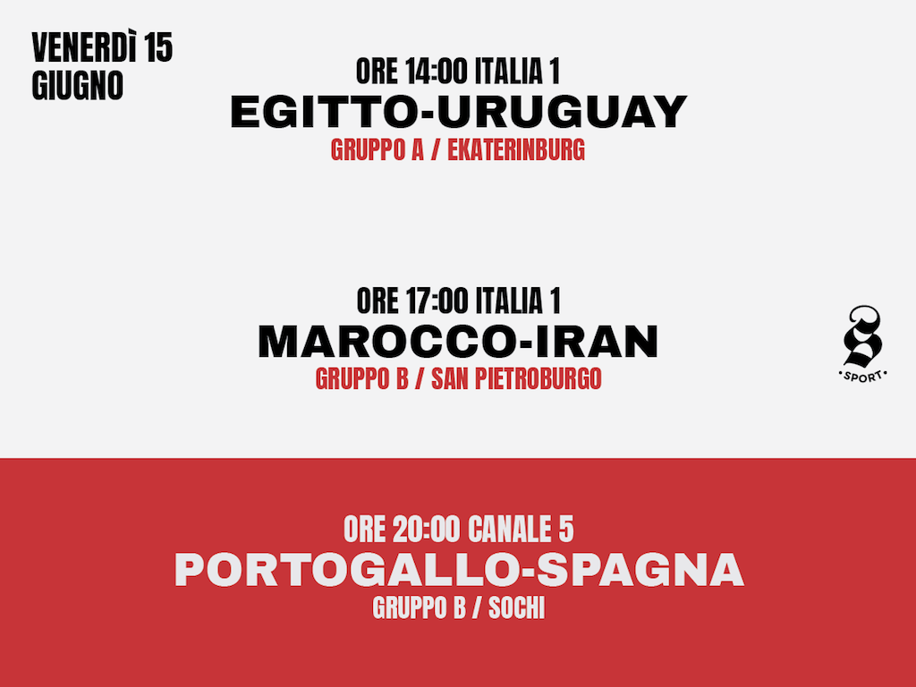 Dopo la partita inaugurale di ieri, oggi sarà la prima vera giornata di partite dei Mondiali di calcio in Russia. In programma ce ne sono tre: la prima, Uruguay-Egitto, è in programma alle 14 e completa la prima giornata del Gruppo A, quello con Russia e Arabia Saudita, che hanno giocato ieri. Fra le 17 e le 20 si giocheranno invece le prime due partite del Gruppo B, Marocco-Iran e Portogallo-Spagna: la seconda è particolarmente attesa, visto che si affrontano due delle squadre più forti del torneo e dato che la nazionale spagnola ha cambiato allenatore due giorni fa dopo un piccolo scandalo.