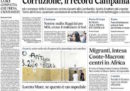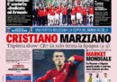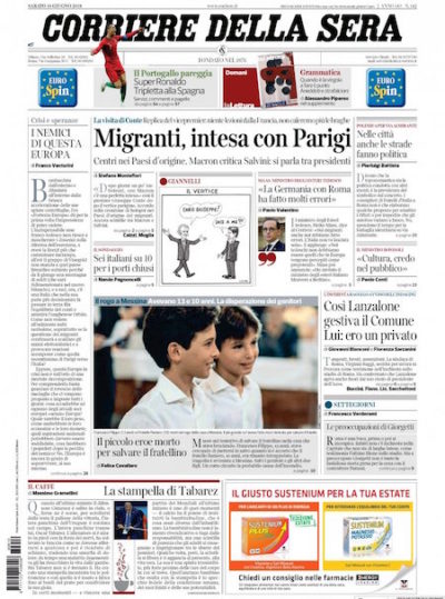 I quotidiani di oggi si dedicano molto alla visita del presidente del Consiglio Giuseppe Conte al presidente francese Emmanuel Macron e all’indagine sulla costruzione del nuovo stadio della Roma, che riguarda soprattutto il M5S romano. Nei boxini c’è spazio per la tripletta di Cristiano Ronaldo alla partita d’esordio del Portogallo ai Mondiali in Russia. Anche i giornali sportivi aprono con Ronaldo, ma si occupano soprattutto di calciomercato.