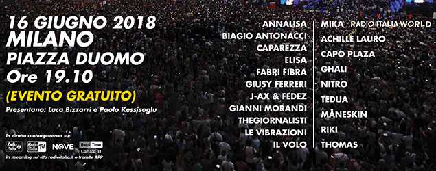 Radio Italia Live, il concerto gratuito organizzato ogni anno a Milano da Radio Italia, è stasera. Inizierà alle 19.10 in Piazza Duomo e si esibiranno in tutto 21 artisti. I conduttori saranno Luca Bizzarri e Paolo Kessisoglu. I cantanti si esibiranno con questo ordine: Tedua, Nitro, Achille Lauro, Capo Plaza e Ghali, Le Vibrazioni, Thomas, Annalisa, Caparezza, TheGiornalisti, Giusy Ferreri, J-Ax e Fedez, Mika (unico ospite straniero), Fabri Fibra, Elisa, Gianni Morandi, Måneskin, Il Volo, Riki e Biagio Antonacci.