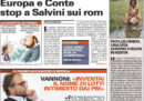 Ci sono notizie diverse in apertura sui giornali di oggi: molti si occupano ancora della proposta del ministro dell’Interno Salvini di schedare i rom presenti in Italia, diventata “non una priorità” ieri sera dopo le proteste di molti partiti compresi gli alleati di governo del Movimento 5 Stelle. La Stampa apre invece sul Documento di Economia e Finanza per il quale il ministro dell’Economia Tria sembra voler ripensare alle proposte contenute nel contratto di governo per la mancanza della copertura finanziaria, il Corriere della Sera, Avvenire e il Messaggero titolano sulla gestione dei migranti nell’Unione Europea, e l’Osservatore Romano commenta le politiche dell’amministrazione Trump che prevedono la separazione dei figli degli immigrati irregolari dai loro genitori.
