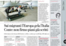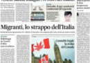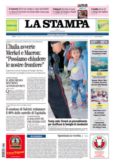 La maggior parte dei giornali di oggi titola sull’incontro fissato per domenica fra Francia, Germania, Italia e Spagna per discutere delle politiche per la gestione dei migranti, al quale però il governo italiano minaccia di non partecipare per la bozza di accordo che sembrerebbe già conclusa che prevede che i migranti siano restituiti ai paesi in cui sbarcano. Avvenire e il Manifesto aprono invece sul ripensamento del presidente degli Stati Uniti Trump sulla decisione di separare i figli dai genitori immigrati irregolarmente, mentre il Giornale e la Verità si occupano della proposta di Salvini di cancellare le cartelle di Equitalia inferiori a centomila euro e Libero di quella di Di Maio di limitare il lavoro nei giorni festivi.