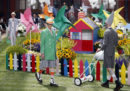 Il pupazzo gigante realizzato dall’artista Kaws per Dior, tutto fatto di fiori, Parigi, 23 giugno 2018