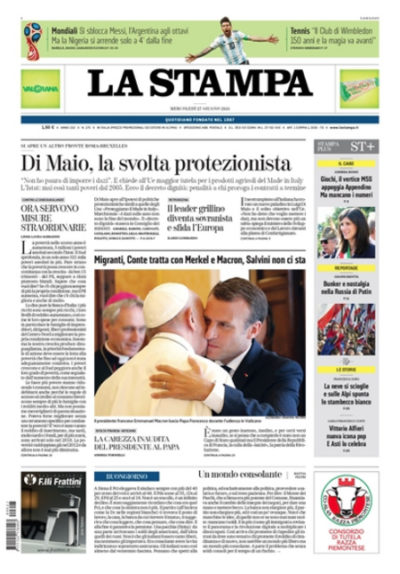 Ci sono notizie diverse in apertura sui giornali di oggi: alcuni si occupano dell’accoglienza dei migranti in Europa, con la vicenda della nave Lifeline che dovrebbe sbarcare a Malta anche se non c’è un accordo sulla destinazione finale dei profughi e la visita a Roma del presidente francese Macron per incontrare Papa Francesco e il presidente del Consiglio Conte. Avvenire e il Dubbio titolano sui dati diffusi dall’ISTAT sulla povertà in Italia, la Stampa e il Giornale aprono sulle parole di Di Maio sui dazi e su internet gratis per i più poveri, e i giornali sportivi si occupano della vittoria dell’Argentina che si qualifica così agli ottavi di finale dei Mondiali.