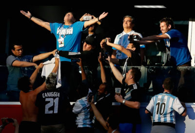 Durante Nigeria-Argentina, la partita dei gironi dei Mondiali con la quale l’Argentina si è qualificata negli ultimi minuti agli ottavi di finale, Diego Armando Maradona è stato fotografato in una posa particolarmente scenografica: in piedi con le braccia spalancate e lo sguardo rivolto al cielo, illuminato da un raggio di sole e circondato da persone protese verso di lui. La foto è stata scattata prima dell’inizio della partita, alla quale l’Argentina arrivava tra moltissime pressioni: una clamorosa eliminazione sembrava dietro l’angolo, e la nazionale argentina, sulla carta tra le più forti del Mondiale, aveva giocato molto male le prime due partite.