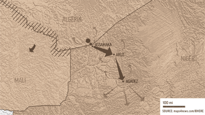 La mappa con il percorso dei migranti che vengono espulsi dall’Algeria e che dal “punto zero” sono costretti a prendere la strada del deserto per arrivare ad Assamaka dove l’OIM li prende in carico e li porta nel centro di Arlit e poi ad Agadez.
