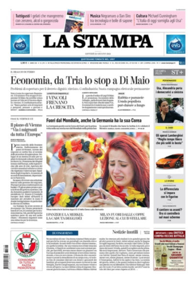 Ci sono notizie diverse in apertura sui giornali di oggi: l’attesa per il Consiglio Europeo che si dovrebbe occupare dell’accoglienza dei migranti, la tenuta dei conti pubblici, con il rinvio da parte del ministro dell’Economia dell’approvazione del decreto “dignità” presentato dal ministro del Lavoro Di Maio per la mancanza della copertura finanziaria e le preoccupazioni di Confindustria per l’andamento del PIL, il taglio delle pensioni dei deputati presentato dal presidente della Camera Fico fra i dubbi sulla costituzionalità del provvedimento, e l’eliminazione della Germania dai Mondiali dopo la sconfitta con la Corea del Sud, sulla quale aprono con una certa soddisfazione i giornali sportivi.