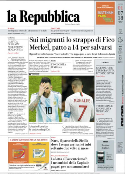 Le prime pagine di oggi contengono principalmente due titoli: quelli sul naufragio che ha provocato la morte di circa 100 persone al largo della Libia, e che alcuni quotidiani usano per attaccare chi difende le ong, e quelli sull’eliminazione di Argentina e Portogallo – e quindi di Lionel Messi e Cristiano Ronaldo – dai Mondiali. Si parla anche delle parole del presidente della Camera Roberto Fico in favore della riapertura dei porti, e della risposta negativa del ministro dell’Interno Matteo Salvini.