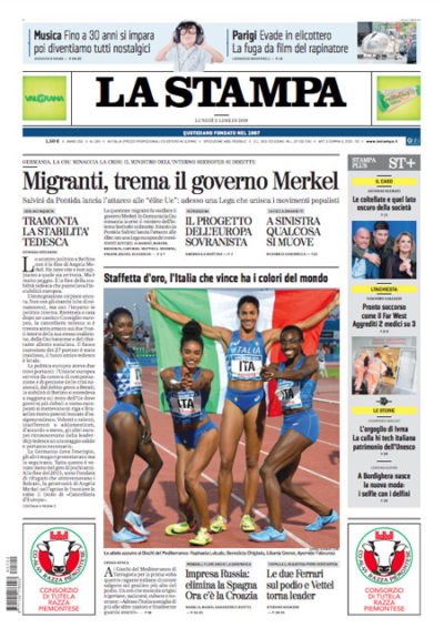 Le due notizie principali in apertura sui quotidiani di oggi sono l’intervento del leader della Lega Salvini al tradizionale raduno di Pontida, nel quale ha proposto un accordo fra tutti i partiti sovranisti d’Europa in vista delle elezioni europee del prossimo anno, e l’annuncio del ministro dell’Interno tedesco Seehofer di volersi dimettere per le diverse opinioni sulla gestione dei migranti con il cancelliere Merkel. I giornali sportivi commentano l’eliminazione dai Mondiali della Spagna, sconfitta ai rigori dalla Russia.
