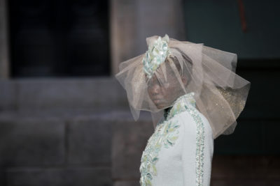 Anche gli abiti avevano un che di metropolitano, dai toni di grigio che ricordavano quelli della città, ai semplici stivaletti alla caviglia. La preziosità degli abiti risaltava nei tessuti e nella raffinata lavorazione artigianale, tra velluti, piume, sete metalliche, tulle, paillettes e maniche chiuse dalle zip che si arrampicano sulle braccia.