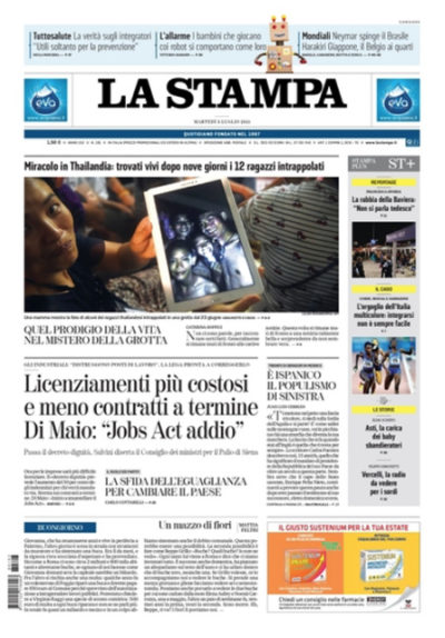 La maggior parte dei giornali di oggi titola in apertura sull’approvazione da parte del consiglio dei Ministri del decreto presentato dal ministro del Lavoro Di Maio, che contiene norme più rigide sui contratti a termine, multe per le aziende che lasciano l’Italia dopo aver ricevuto aiuti e il divieto di pubblicità per i giochi. Su molte prime pagine è presente anche la notizia e la foto del ritrovamento dei ragazzini che si erano persi in una grotta in Thailandia, mentre il Manifesto e la Verità seguono ancora le notizie sull’accoglienza dei migranti in Europa, Libero critica la “discriminazione” nei confronti degli atleti italiani bianchi dopo la vicenda della foto delle ragazze che hanno vinto la staffetta ai Giochi del Mediterraneo, e il Dubbio commenta le motivazioni della sentenza sulla strage di via D’Amelio.