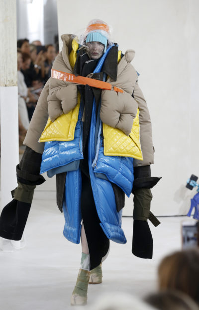 Le forme e le decorazioni degli abiti della collezione ricordano quelle dei grandi maestri del passato – dai colli avvolgenti di Paul Poiret, il più grande stilista di alta moda del primo Novecento, a corsetti, piume, pizzi e broccati – ma sono realizzate con tessuti moderni e inaspettati: nylon, gommapiuma e piumini, appaiati con i classici organza e tulle.