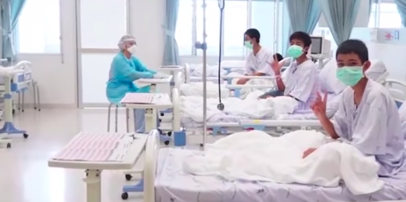 Il governo thailandese ha diffuso il primo video che mostra i ragazzini salvati dalla grotta di Tham Luan, dove erano rimasti bloccati per più di due settimane. Il video è stato girato nell’ospedale di Chiang Rai, dove tutti e 12 i ragazzini e il loro allenatore rimarranno ricoverati per circa una settimana. Al momento si trovano in uno speciale reparto dell’ospedale, dove possono vedere i loro genitori attraverso una parete di vetro: è una precauzione adottata in attesa che vengano fatti loro tutti gli esami necessari per escludere che ci siano infezioni o problemi di altro genere.