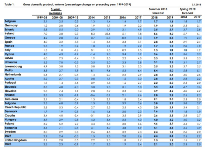 La Commissione Europea ha abbassato le sue stime di crescita per l’Europa rispetto a quelle precedenti pubblicate lo scorso maggio. Secondo la Commissione, i 28 paesi dell’Unione Europea cresceranno del 2,3 per cento nel 2018 e del 2,1 per cento nel 2019, rispetto al 2,5 e al 2,2 per cento stimati in primavera per lo stesso periodo. Il paese che crescerà di più sarà l’Irlanda, con un tasso di crescita stimato al 5,6 per cento nel 2018. Quello che cresce più lentamente è l’Italia, che secondo le nuove stime crescerà nel 2018 dell’1,3 per cento, rispetto all’1,5 stimato in precedenza, e poi dell’1,1 nel 2019, rispetto all’1,2 della stima primaverile. Secondo la Commissione, le ragioni principali del rallentamento sono due: le tensioni commerciali, in particolare quelle con gli Stati Uniti, e l’aumento del prezzo del petrolio.