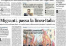 Molti dei titoli dei giornali di oggi sono sulla situazione dei 442 migranti a bordo del pattugliatore britannico Protector e del Monte Sperone della Guardia di Finanza italiana, 100 dei quali – ha detto il presidente del Consiglio Giuseppe Conte – saranno accolti da Malta e Francia, dopo l’opposizione del ministro dell’Interno Matteo Salvini ad accoglierli. Si parla anche della polemica tra il ministro del Lavoro Luigi Di Maio e il ministero dell’Economia sui numeri che accompagnano il decreto dignità, e della finale dei Mondiali tra Croazia e Francia, oggi alle 17.