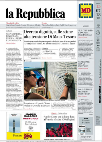 Molti dei titoli dei giornali di oggi sono sulla situazione dei 442 migranti a bordo del pattugliatore britannico Protector e del Monte Sperone della Guardia di Finanza italiana, 100 dei quali – ha detto il presidente del Consiglio Giuseppe Conte – saranno accolti da Malta e Francia, dopo l’opposizione del ministro dell’Interno Matteo Salvini ad accoglierli. Si parla anche della polemica tra il ministro del Lavoro Luigi Di Maio e il ministero dell’Economia sui numeri che accompagnano il decreto dignità, e della finale dei Mondiali tra Croazia e Francia, oggi alle 17.