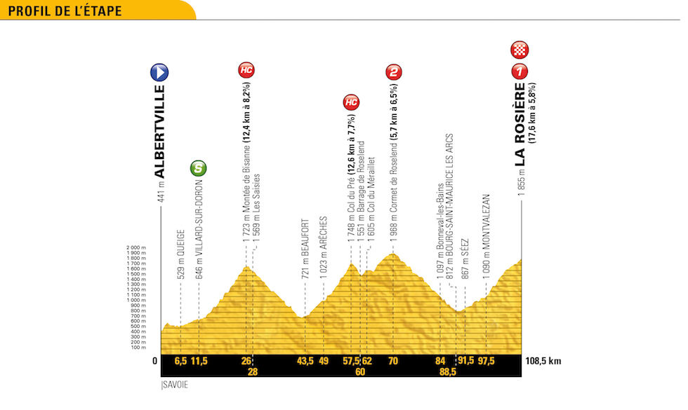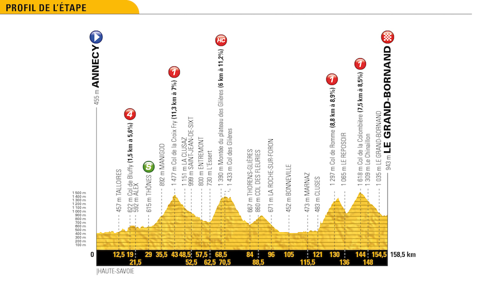 È la prima vera tappa di montagna, dopo un giorno di riposo. Frase che gli esperti di ciclismo conoscono a menadito: “dopo un giorno di riposo non si sa mai cosa può succedere”, perché qualcuno si riposa, si rimette in sesto e riparte più in forma di prima, mentre qualcun altro invece “rompe il ritmo” e si ritrova più lento di prima. Ci sono cinque salite e l’arrivo è dopo una decina di chilometri di discesa e circa cinque chilometri di pianura. La Montée du plateau des Glières, a circa 100 chilometri dall’arrivo, è lunga poco più di 6 chilometri ma ha una pendenza media oltre l’11 per cento e un paio di chilometri in sterrato: come il Colle delle Finestre, la salita su cui Froome ha vinto il suo Giro d’Italia. La Montée du plateau des Glières è una salita inedita per il Tour; la più famosa salita di giornata è il Col de la Colombière, la cui vetta è a 15 chilometri dall’arrivo.