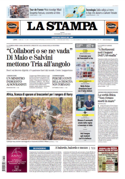 La maggior parte dei giornali apre sulle tensioni nel governo con il ministro dell’Economia Tria sulle nomine dei nuovi vertici di Cassa Depositi e Prestiti e su quelle fra il ministro del Lavoro Di Maio e il presidente dell’INPS Boeri sugli effetti del “decreto dignità”. Il Fatto, il Dubbio e il Giornale di Sicilia titolano invece sulle motivazioni della sentenza del processo sulla “trattativa” fra Stato e mafia depositate ieri, mentre il Giornale prosegue la sua campagna sulla nomina di un’amica di Di Maio nella sua segreteria.