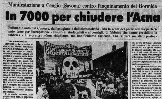 Negli anni Ottanta la provincia di Asti insieme ad altre amministrazioni cittadine denunciò l’ACNA per i danni ambientali, ci furono lievi condanne per i dirigenti in primo grado, cui fecero seguito assoluzioni in appello. Morti sospette per cancro alla vescica spinsero i sindacati a costituirsi parte civile, ma si ritirarono dal processo su presunte pressioni da parte dell’azienda. I sindacati confermarono la posizione mantenuta per decenni, dimostrando l’interesse per il mantenimento dei posti di lavoro, che in molti casi superava quello per tutelare l’ambiente e la popolazione della val Bormida.