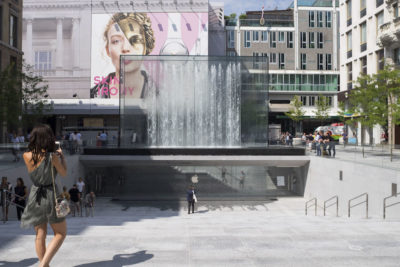 L’elemento che spicca più di tutti è un grande parallelepipedo di vetro, intorno al quale è stata costruita una fontana, con getti d’acqua che creano un effetto a cascata lungo le vetrate. Sotto l’immancabile logo di Apple, c’è l’ingresso con una scala che con un paio di rampe porta al negozio vero e proprio, sotterraneo. Davanti al parallelepipedo si apre invece una grande scalinata che ricorda quella degli antichi anfiteatri in pietra: offre un ulteriore accesso al negozio ed è stata pensata come punto di ritrovo, per sedersi al sole o per seguire gli eventi che saranno organizzati da Apple nella piazza in collaborazione con il Comune.