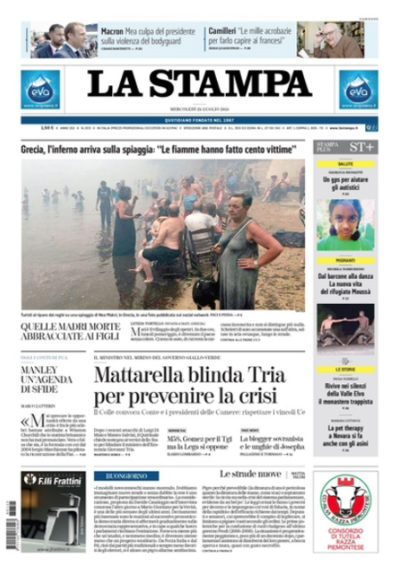La maggior parte dei giornali di oggi si occupa in apertura degli incendi in Grecia che hanno provocato oltre settanta morti accertati e danni gravissimi, anche se si teme che il numero delle vittime possa essere ancora più alto. Il Sole 24 Ore apre invece sull’attesa per la decisione del ministro Di Maio sulla gara per la vendita dell’ILVA, il Fatto segue ancora le voci sui nuovi vertici della RAI, e il Giornale, Libero e il Tempo si occupano della decisione della Corte europea sullo sgombero dei campi rom. I giornali sportivi seguono le notizie sul calciomercato del Milan dopo i cambiamenti al vertice della società.