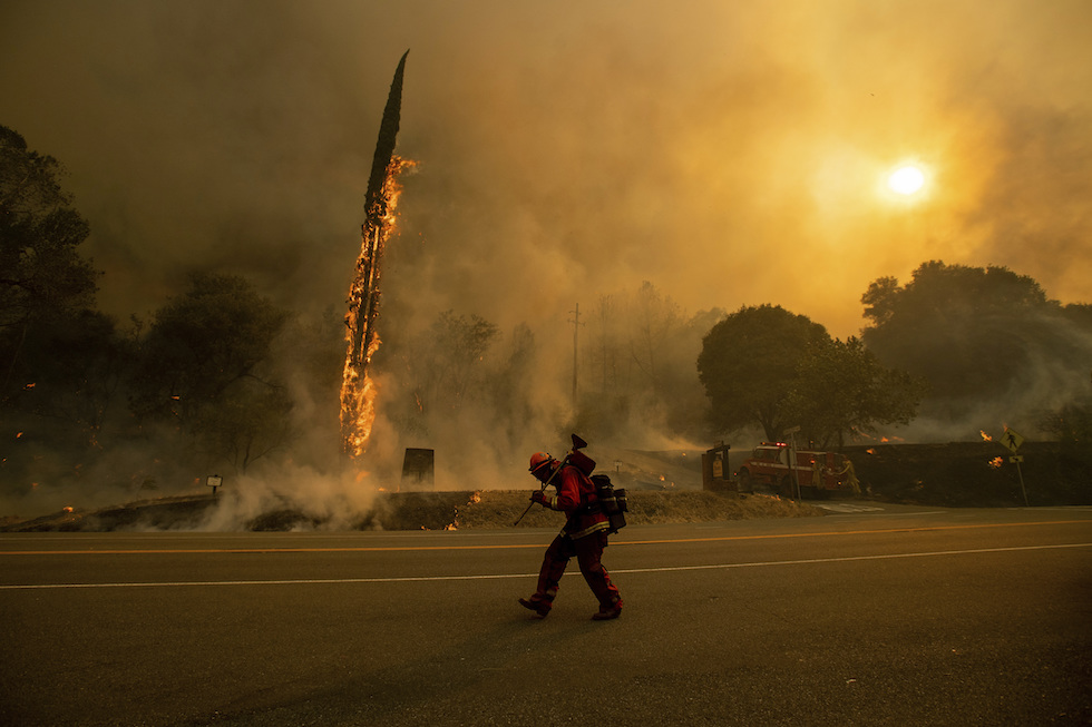 Un vigile del fuoco sulla Highway 299 vicino a Shasta, California, 26 luglio 2018