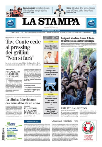 Ci sono notizie diverse in apertura sui quotidiani di oggi: Repubblica, la Stampa e il Secolo XIX titolano sulle indiscrezioni sulla decisione che sarebbe stata presa dal presidente del Consiglio Conte, nonostante le obiezioni della Lega, di bloccare i lavori per la TAV, il Manifesto, il Messaggero, Libero e la Verità aprono sullo sgombero di un campo rom a Roma, Avvenire e il Dubbio si occupano delle parole del presidente della Repubblica Mattarella sul ferimento di una bambina rom a Roma, il Corriere della Sera intervista il presidente del Consiglio Conte, e il Giornale presenta le nuove iniziative politiche di Silvio Berlusconi. I giornali sportivi titolano sul calendario del prossimo campionato di serie A, sorteggiato ieri.