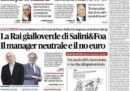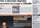Le due notizie principali in apertura sui quotidiani di oggi riguardano l’azione del governo, e sono le nomine dei nuovi presidente e amministratore delegato della RAI e le differenze di opinioni fra Lega e Movimento 5 Stelle sui lavori per la TAV, che i secondi vorrebbero bloccare mentre i primi si dichiarano favorevoli. Il Sole 24 Ore e Libero aprono invece sull’esame del “decreto dignità” da parte del Parlamento, mentre il Manifesto titola sul ferimento di un operaio straniero con un colpo di arma da fuoco sparato da una casa vicino a Vicenza, e i giornali sportivi seguono la trattativa per il possibile ritorno alla Juventus di Bonucci.
