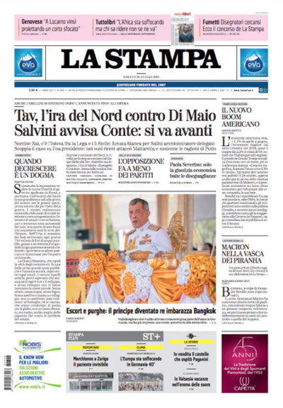 Le due notizie principali in apertura sui quotidiani di oggi riguardano l’azione del governo, e sono le nomine dei nuovi presidente e amministratore delegato della RAI e le differenze di opinioni fra Lega e Movimento 5 Stelle sui lavori per la TAV, che i secondi vorrebbero bloccare mentre i primi si dichiarano favorevoli. Il Sole 24 Ore e Libero aprono invece sull’esame del “decreto dignità” da parte del Parlamento, mentre il Manifesto titola sul ferimento di un operaio straniero con un colpo di arma da fuoco sparato da una casa vicino a Vicenza, e i giornali sportivi seguono la trattativa per il possibile ritorno alla Juventus di Bonucci.