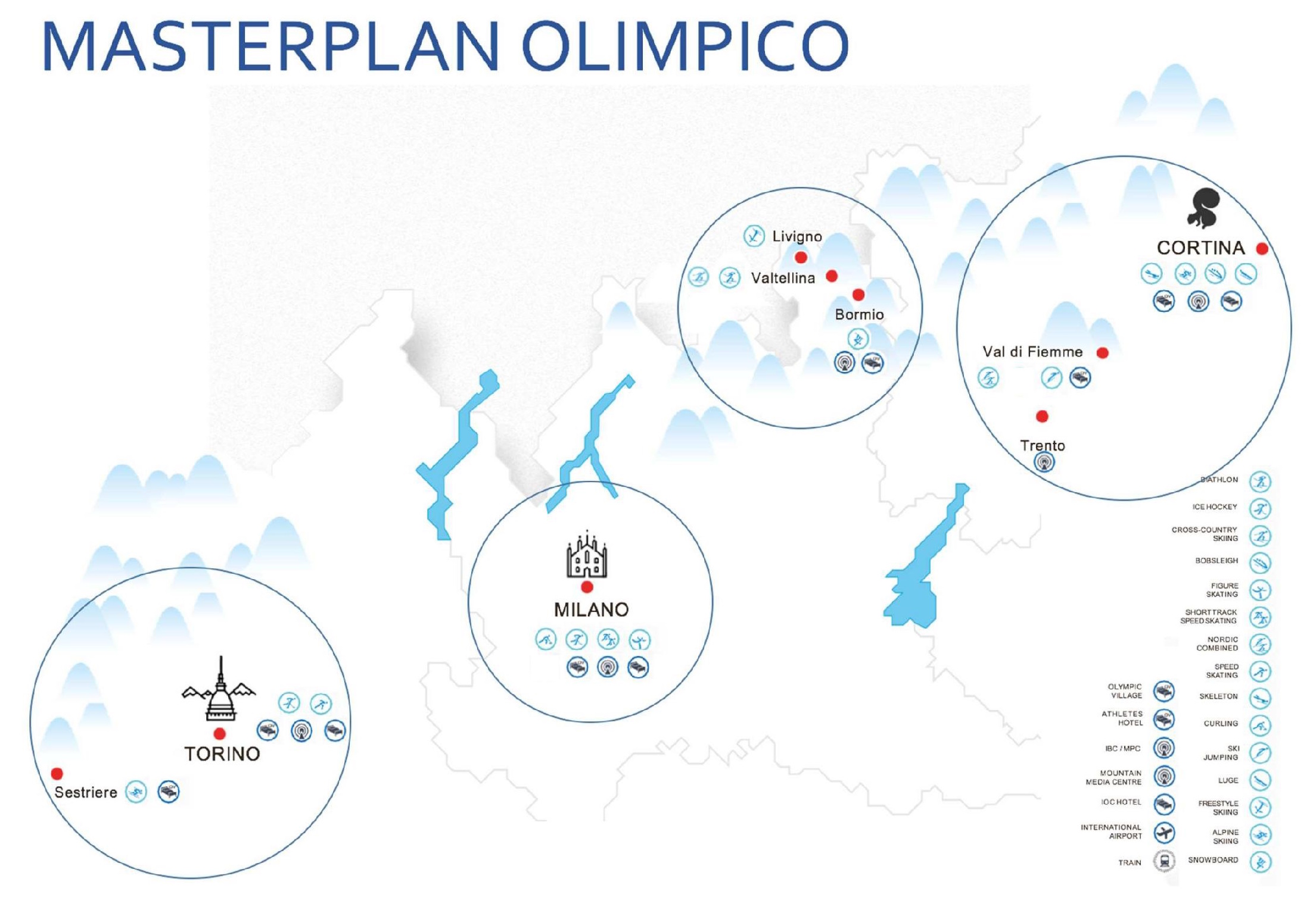 Secondo i piani del Coni, le gare e le strutture saranno divise più o meno equamente fra Milano, Torino e Cortina, insieme al coinvolgimento di altre località come il Sestriere – l’unica già presente alle Olimpiadi invernali del 2006 ospitate da Torino – la Valtellina e la Val di Fiemme. A Milano dovrebbe avere sede il villaggio olimpico principale, che sarà costruito nell’ex scalo ferroviario di Porta Romana, e le strutture per ospitare le gare di hockey, short track e curling. A Torino dovrebbe sorgere il principale hotel per gli atleti, da 834 posti, e saranno ospitate altre gare di hockey e alcune di speed skating. Le competizioni di sci e snowboard si terranno in diversi posti sulle Alpi. In tutte e tre le città ospitanti ci sarà una medal plaza, sede delle premiazioni.