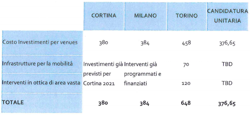 Nel documento di presentazione della candidatura condivisa (PDF), il Coni ha motivato la sua scelta citando ragioni di costi e «sinergie fra i territori». Sfruttando gli impianti e le strutture già esistenti, secondo le stime del Coni, organizzare le Olimpiadi in tre città diverse costerà circa 376,65 milioni di euro: una cifra inferiore ai preventivi presentati dalle tre città (ma che ancora non tiene conto delle spese per adeguare le infrastrutture per la mobilità, ad esempio).