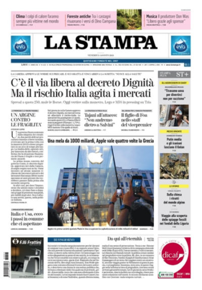 Ci sono notizie diverse in apertura sui giornali di oggi: l’approvazione alla Camera del “decreto dignità”, il calo della Borsa di Milano e l’aumento dello spread, la vicenda della nomina a presidente della RAI di Marcello Foa dopo la bocciatura della Commissione di Vigilanza e le tensioni nel centrodestra, la modifica al catechismo della chiesa cattolica con l’opposizione netta alla pena di morte, le ipotesi sul futuro di Alitalia, e l’arresto di tre ragazzi per l’aggressione a Daisy Osakue.
